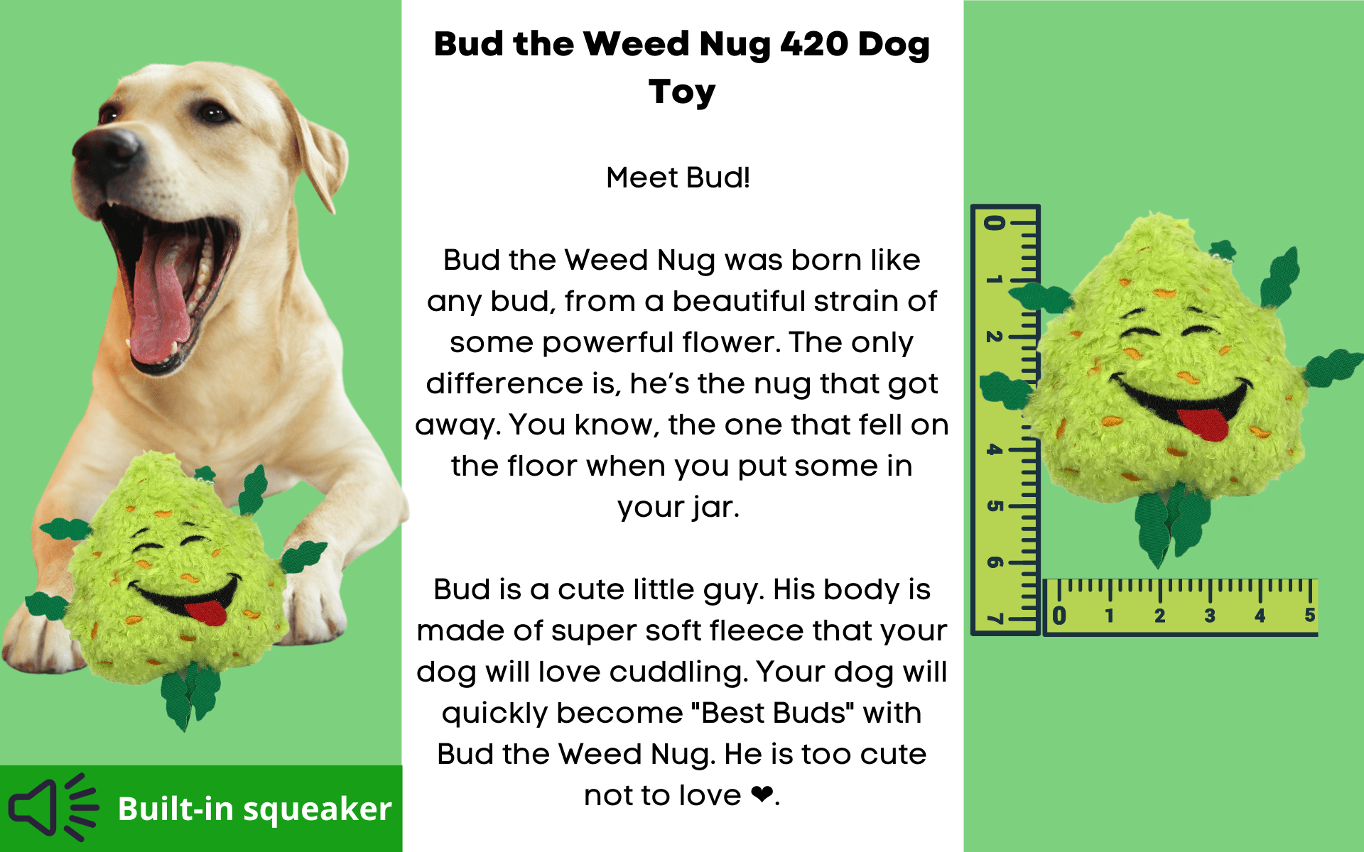 Meet Bud! He is a cute little guy about 6" tall and 4" wide. He has a built-in squeaker and isgreat for light play. Better yet; for Instagram pics and video of your pet with his own "bud". Your dog will love joining you for 4:20!