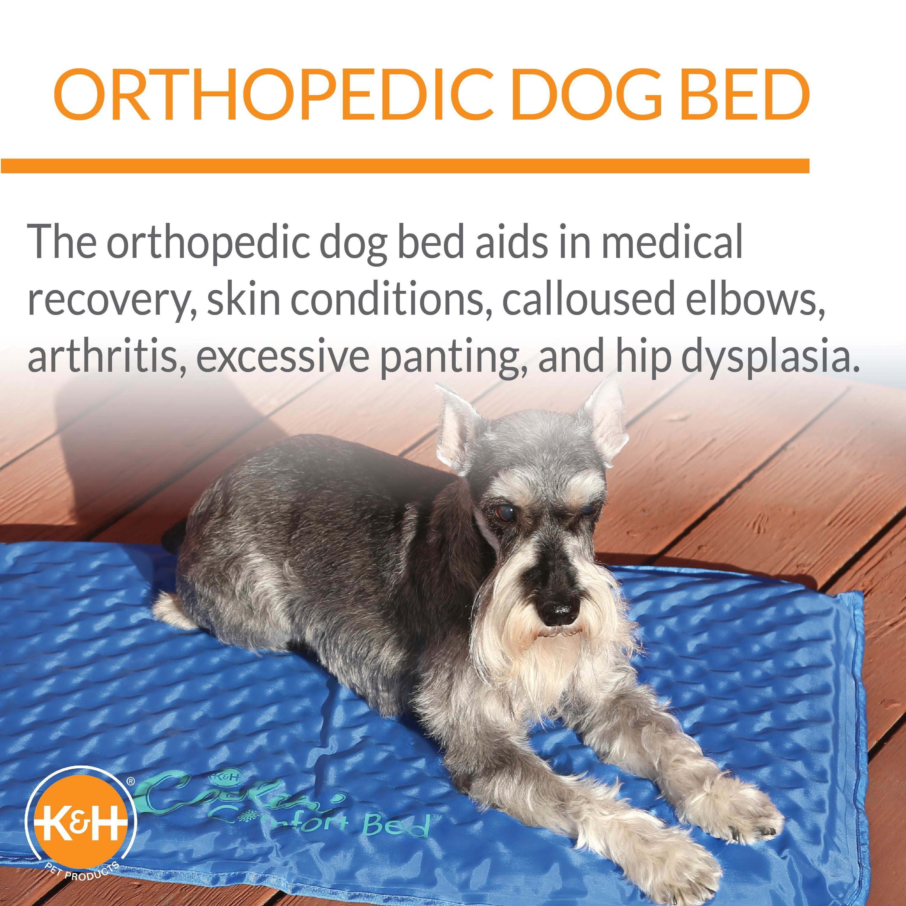 K&H's most comfortable cooling dog bed to date! No electricity is required to operate the orthopedic Coolin' Comfort Bed. Attractively designed to provide a cool spot for dogs. Simply add water just once through the easy fill cap and adjust the comfort with the easy air valve. It contains no toxic gels. Tough nylon/vinyl exterior. The orthopedic dog bed aids in medical recovery, skin conditions, calloused elbows, arthritis, excessive panting, and hip dysplasia. The K&H Coolin' Comfort Bed is the affordable choice for any dog owner looking to offer their pet a comfy, dry, cool place to relax. Recommended for indoor and outdoor use. Two year limited warranty.