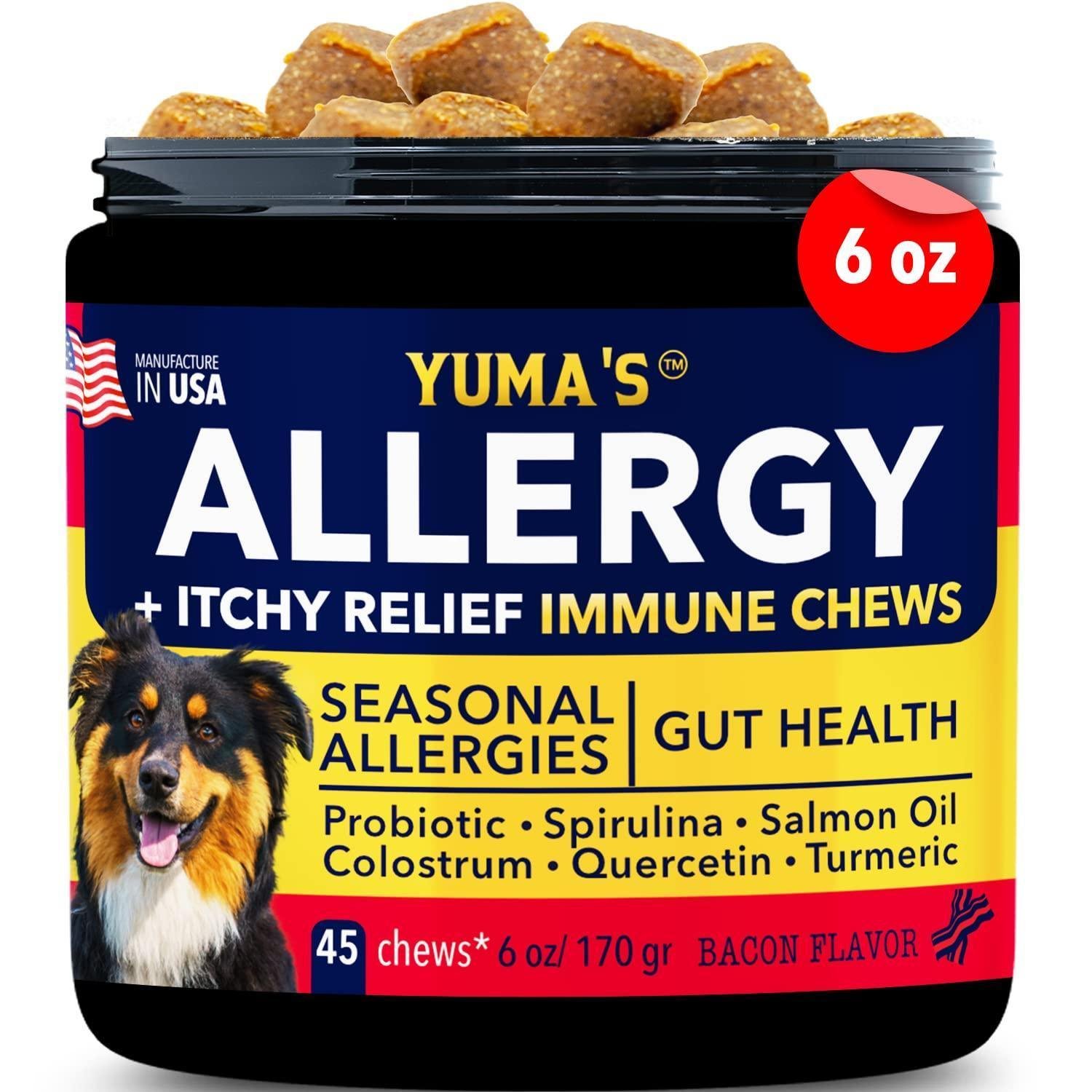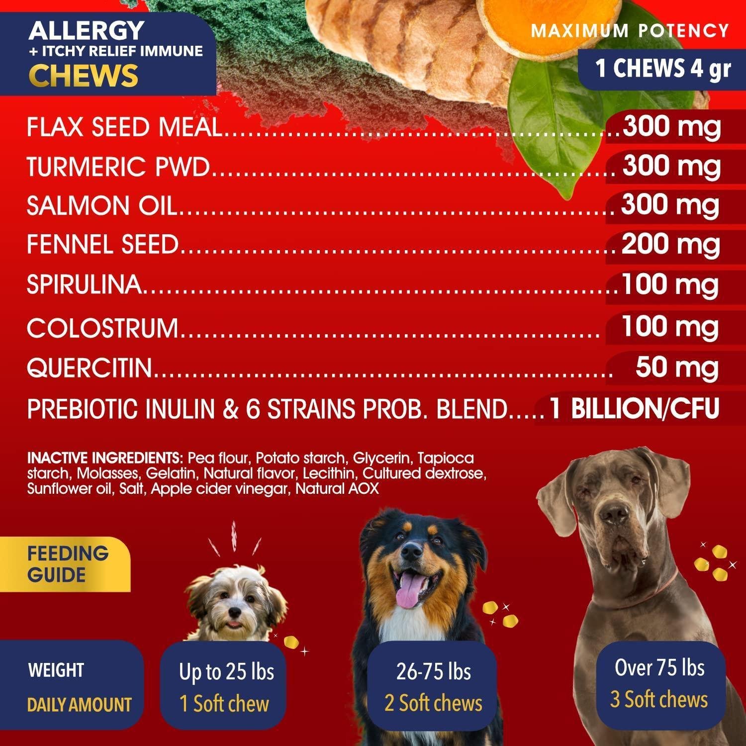 2.Dog Allergy Relief Formula The ingredients in our itch relief chews for dogs include colostrum, salmon oil, flax seed, spirulina and probiotics. Our dog immune supplement contains antihistamine and decongestant properties that quickly help relieve your pup's discomfort during seasonal and food allergies